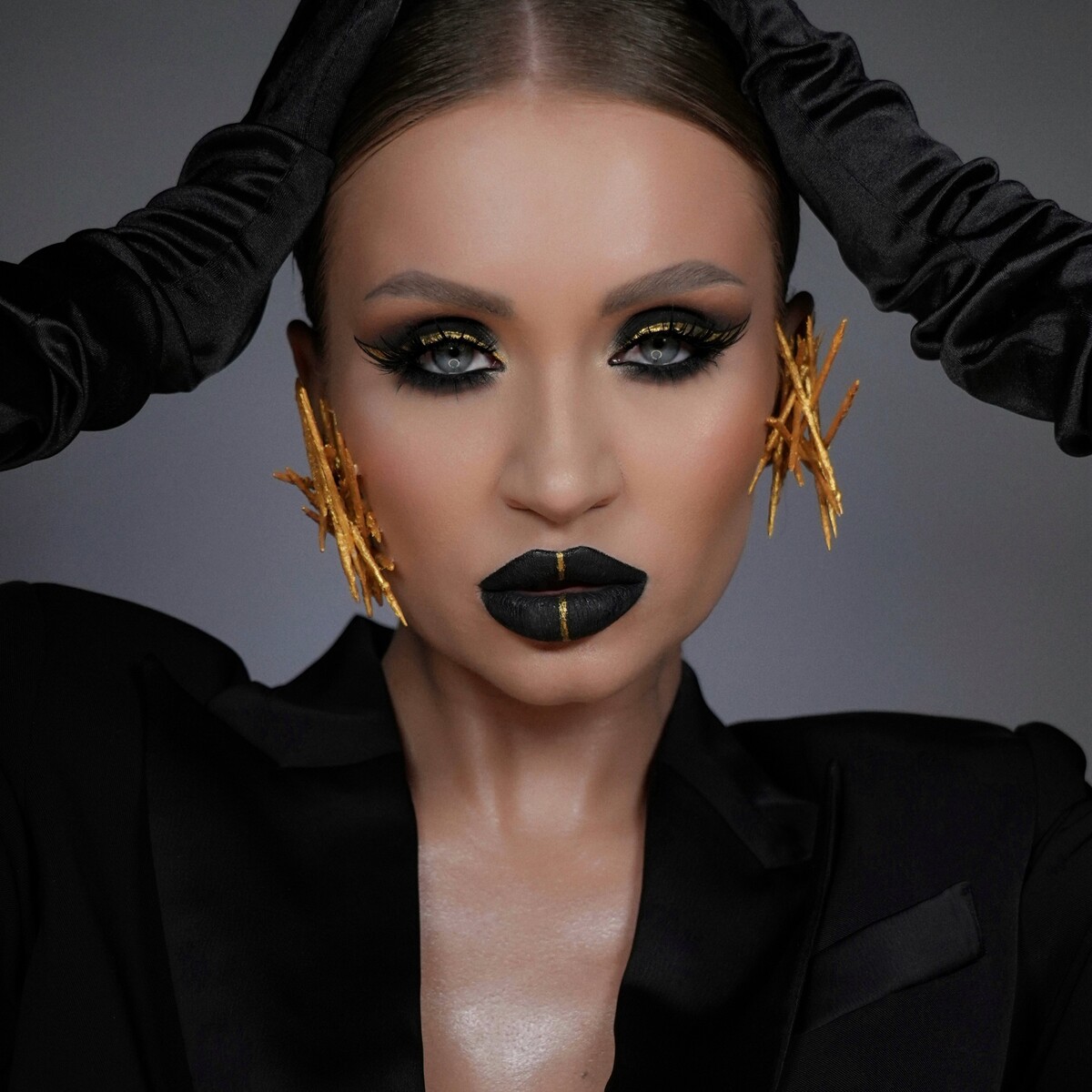 В уроке подробна показана работа на глазу с черным цветом и на этапе подложки, и на этапе сухих текстур. А также, как создавать стойкие яркие акценты в своих макияжах (на примере золотой графики).